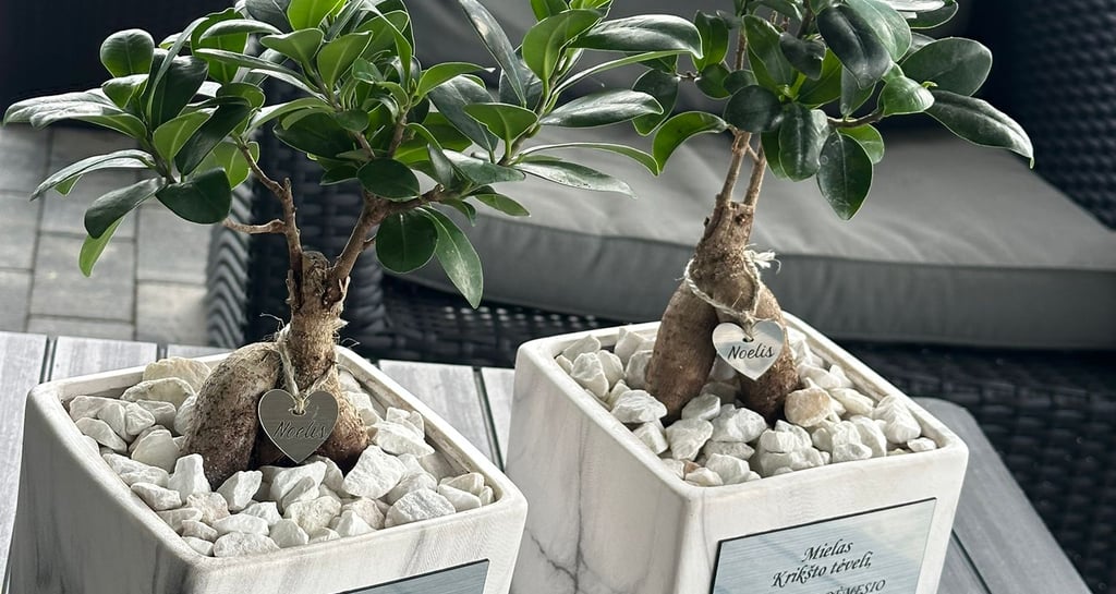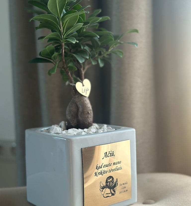 Unikalūs vazonai su graviruotais sveikinimais ir bonsais.