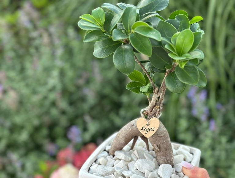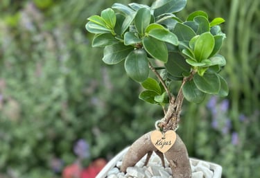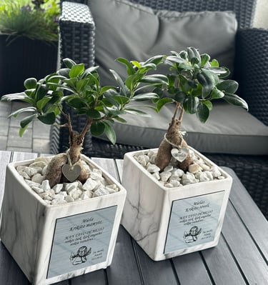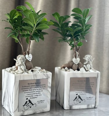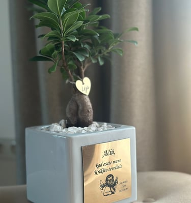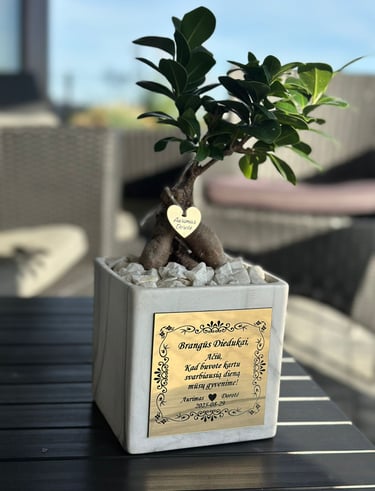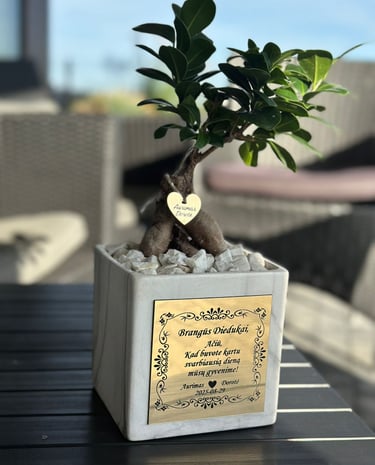 Mes gaminame unikalius vazonus su graviruotais sveikinimais ir išskirtinės kokybės bonsais, pritaikytus įvairioms progoms.